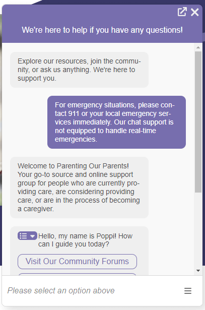 Need Help? Got questions? Need a hand with something on the site? Reach out through POP Chat or drop us a line at info@parentingourparents.info.