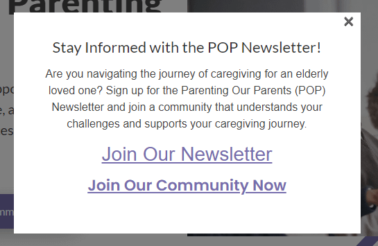 Hey everyone! We’ve been busy over here at Parenting Our Parents (POP), working on some cool new updates to make our website even better for you. We’re excited to roll out a few features we think you’ll love, including a brand-new chat system, an updated newsletter, and a handy sign-up pop-up for new visitors. Here’s the scoop on what’s new: